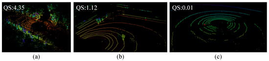 After receiving a new sweep, the firstly performed feature extraction is employed to divide the original point cloud into edge points, , and plane points, , according to the smoothness of the local surface []. The set of total features is denoted as at the n-th frame. The smoothness, , of the LiDAR point is calculated as follows: