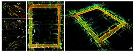 3D bird’s-eye view map of the campus sequence. The quantitative structure of the three locations is emphasized as (a–c). Figure (d,e) show point cloud maps from a bird’s-eye perspective, presenting the consistent map without point cloud divergence.