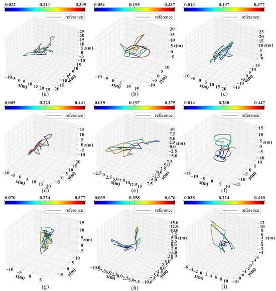 Localization accuracy experiments are performed on the NTU-VIRAL dataset. The trajectories’ errors are compared with the ground truths, which are provided by the public dataset. Subfigures (a–i) represent the trajectory results for the rtp sequence, the sbs sequence, and the tnp sequence, respectively. The “reference” in the subfigure is the ground truth of the UAV trajectory. The heat map color of the estimated trajectories indicate the error level.