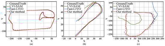 Trajectory comparisons on the private dataset. Subfigures (a–c) are indicate the comparisons on the grove, beach, and desert sequences. As the degree of non-structuring increases, the robustness of LVI-SAM and FAST-LIVO decreases. The proposed system can still maintain high localization accuracy.