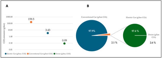 (A) CO2 emission of combustion cars, electric cars and drones per km traveled on logarithmic scaling. (B) Displays the differences in CO2 emissions produced by drones, electric vehicles, and combustion cars during medical sample transportation, highlighting the environmental benefits of each method. Ratio of CO2 emission from the different transportation vehicles.