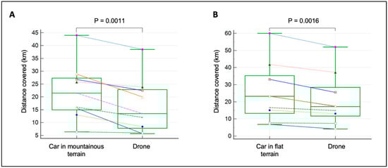 Drones also demonstrated notable efficiency advantages in terms of transport distances. On flat terrain, drones followed a path that was, on average, 17% shorter than that taken by cars (p = 0.0016). In mountainous terrain, drones showed an even greater reduction in transport distances, averaging 24% shorter routes compared to cars (p = 0.0011). These efficiencies are likely due to the ability of drones to navigate directly between points without the constraints of road networks (Figure 3).