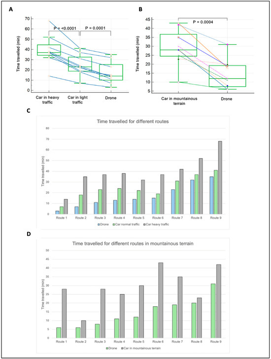 Time of transport method compared over different routes. (A) Minutes traveled by a car in heavy traffic, light traffic and by the drone on flat terrain and nine different routes (B) Minutes traveled by a car and the drone compared on nine mountainous routes. Lines connected represent the same route traveled by the different transport methods. (C) Time traveled in comparison for each route separately for flat terrain with heavy or light traffic respectively. (D) Time traveled for reach route on mountainous terrain.