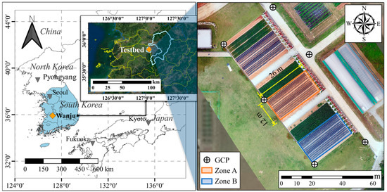 Study site overview: Location of the Kimchi cabbage testbed within the Republic of Korea (left) and detailed layout of the testbed at the National Institute of Agricultural Sciences (NAS) showing soil zones (A and B) and ground control point (GCP) locations (right).