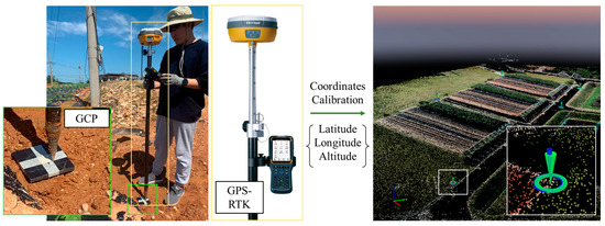 The acquired RGB images and cloud data were processed into DSM orthomosaics and RGB orthomosaics, which were then geometrically corrected using Pix4Dmapper (https://www.pix4d.com/product/pix4dmapper-photogrammetry-software, Pix4D, Prilly, Switzerland) software. The geometric correction ensured the accurate alignment of the acquired images with reference locations, enabling the spatial analysis. The GCPs, predefined ground locations with known coordinates established using permanent structures within the field, were used for this correction [25]. By matching an image of the GCP locations with their corresponding coordinates for each acquisition date, the image position was effectively calibrated over time, facilitating a comparative analysis of the Kimchi cabbage growth at the same location across the images. Both the GCP coordinates and the image coordinate system were unified as WGS 84 UTM zone 52 N (Figure 3).