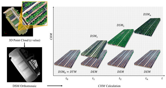 where CHM is the Kimchi cabbage height for each growth stage estimated using drone RS, is the surface model for each Kimchi cabbage growth stage, and DTM is the unique numerical terrain model of the farmland [27,28].