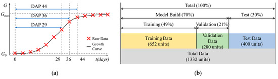 These data points served as the learning data for the logistic growth curve. The resulting growth curve was then used to train a model for predicting the Kimchi cabbage height on the harvest day. In Figure 5a, we can see the logistic curves generated using the data from three different time points (29, 36, and 44 DAPs). These curves were used for the model training. Figure 5b illustrates the data partitioning strategy. The Kimchi cabbage data (1332 data points for each date) were divided into 70% for model training and 30% for testing, without distinction between areas A and B. The training data were further divided into 70% for learning and 30% for verification purposes.