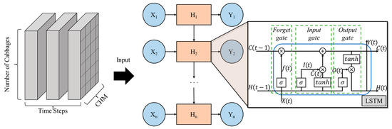 The LSTM model received the CHM data, extracted from the logistic growth curve, as the input. These data were formatted as a three-dimensional matrix encompassing Kimchi cabbages (number of data points), time steps (time intervals), and the CHM (independent variables) (Figure 6). The model was then used to predict the CHM for each Kimchi cabbage on the harvest day (8 November 2019).