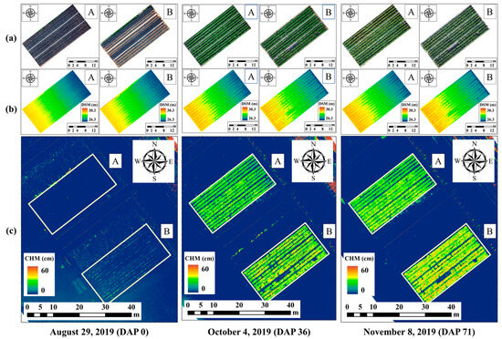 Figure 7 demonstrates the effectiveness of drone imagery for monitoring Kimchi cabbage growth. The figure displays (a) RGB orthomosaics, (b) DSMs, and (c) CHM maps for three representative dates (DAP 0, DAP 36, and DAP 71). A visual inspection of the RGB orthomosaics (Figure 7a) allows for a general assessment of the plant health based on color variations. However, this method cannot quantify the Kimchi cabbage height. DSMs (Figure 7b) address this limitation by representing the Kimchi cabbage height as the ellipsoid height within a reference coordinate system. While DSMs cannot provide the absolute height of individual plants, they enable the visualization of height variations across the field over time through a time series analysis. CHM maps (Figure 7c) offer the most precise height information. These maps are generated by subtracting the DTM from the DSM orthoimage. This numerical representation removes the influence of the terrain slope, allowing for the accurate extraction of Kimchi cabbage height data. As evident in Figure 7c, the CHM map for DAP 71 reveals slower growth in Zone A and the complete absence of Kimchi cabbages in Zone B, likely due to environmental factors.
