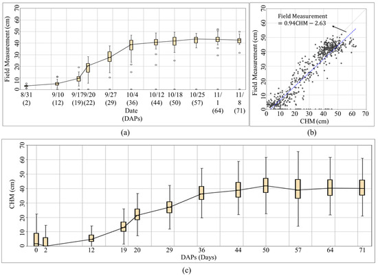 Figure 8a depicts the distribution of the field measurements of the Kimchi cabbage height values using a boxplot. The boxplot reveals a growth range of approximately 0 to 50 cm, with the most significant growth occurring between 10 September and 4 October. Additionally, the spread of the Kimchi cabbage height increased substantially by October 4th, reaching a difference of about 25 cm between the maximum and minimum values. This spread then narrowed after 12 October.