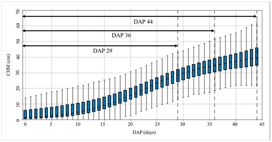 A logistic growth curve was employed to interpolate the missing values in the Kimchi cabbage height data and to model the overall growth trend (Figure 8c). Figure 9 illustrates logistic growth curves for three scenarios, each representing Kimchi cabbage growth up to a specific time point: 29, 36, and 44 DAPs. Additionally, a boxplot in Figure 9 visualizes the daily variations in the CHM, the estimated plant height from drone imagery.