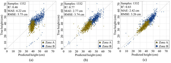 Figure 10 presents the predicted Kimchi cabbage height maps generated by applying the three models to the entire field. The results indicate that the predicted heights in Zone A (loam) primarily ranged from 30 to 40 cm, while Zone B (sandy loam) exhibited heights between 40 and 55 cm. This 10–15 cm difference aligns with observed soil condition variations and the slightly faster growth rates reported for Kimchi cabbage in loam compared to sandy loam [10]. This trend is further reflected in the smaller height discrepancies between the measured and predicted values in sandy loam (Zone B) during the early growth stages (Figure 10a).