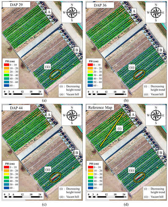 Figure 11 presents a reference map for comparison, constructed based on the DAP 71 (harvest day) predictions from each model and a field image captured on 8 November 2019. Zone A (loam soil) and Zone B (sandy loam) in the reference map exhibit distinct characteristics due to the soil composition. Zone A primarily shows Kimchi cabbage heights ranging from 30 to 50 cm, while Zone B displays a higher concentration of Kimchi cabbages exceeding 40 cm. Additionally, the reference map includes features marked by arrows indicating a general trend of decreasing Kimchi cabbage heights in Zone A and locations with frequent vacant hills (Figure 11 (i),(ii)).