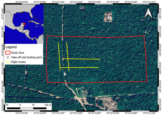 Study area located in the “Uxuxubi al natural” reserve, Yucatan Peninsula, Mexico where drone flights were performed to evaluate the behavioral response of the spider monkeys. The flight routes shown on the map are just a few examples of those used during the study.