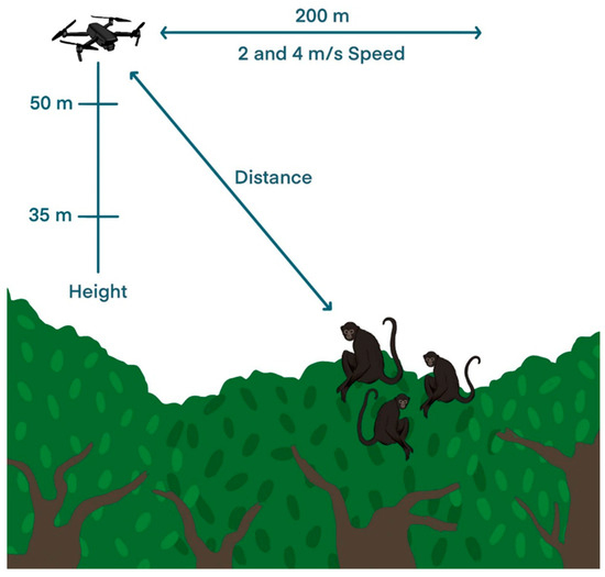 The 200 m straight-line flight transect along which we flew the drone over the spider monkey subgroup featuring the two heights, the two speeds, and the distance between the focal subject and the drone (illustration by Aranza María Hernández Goméz).