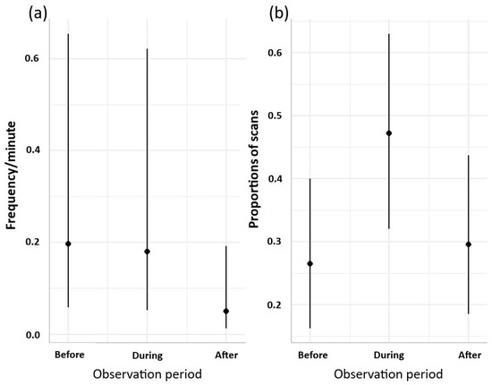 In the case of state-type behaviors, we found that the observation period only influenced the proportion of scans in which spider monkeys rested (LRT: χ2 = 18.74, df = 2, p < 0.001, R2m = 0.05, R2c = 0.88). Resting was performed in a higher proportion of scans during the drone flights compared to before (p < 0.001) and after (p = 0.001) flights, while there was no difference between before and after flights (p = 0.69; Figure 3b). There was no evidence that the observation period influenced spider monkeys engaging in feeding (LTR: χ2 = 2.70, df = 2, p = 0.25, R2m = 0.01, R2c = 0.87), moving (LTR: χ2 = 1.61, df = 2, p = 0.44, R2m = 0.02, R2c = 0.66), and social behaviors (LTR: χ2 = 0.28, df = 2, p = 0.86, R2m = 0.001, R2c = 0.96). We could not test alarm calling because the monkeys did not emit such vocalizations during data collection.