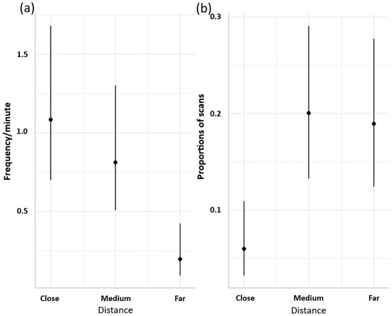 Predicted frequencies for vigilance (a) and proportion of scans spent resting (b) based on the two GLMMs testing the effects of the three distance categories. The bars represent the predicted estimates’ 95% confidence intervals.