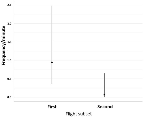 Predicted frequencies of agonistic display based on the GLM testing the effect of flight subset. The bars represent the predicted estimates’ 95% confidence intervals.