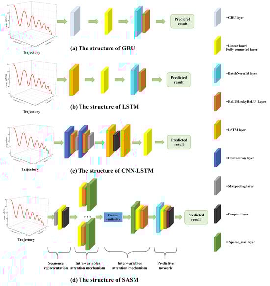 Figure 12b shows. It is evident that the prediction based on the SASM was closest to the true trajectory and had the smallest error. The GRU followed closely, with the CNN-LSTM slightly behind the GRU, while the LSTM exhibited a more pronounced deviation from the actual trajectory compared to the other two models. Overall, the models’ predictive accuracy values are ranked as follows: SASM > GRU> CNN-LSTM > LSTM.