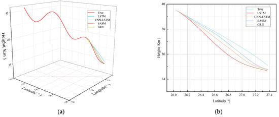 Figure 12a, the 3D predicted trajectories of all four models generally maintained the trend of the actual trajectory. Notably, the SASM method demonstrated the smallest error and superior predictive performance compared to other models. The projected values of the three methodologies onto the latitude and longitude coordinate axes demonstrated minimal deviation from the actual values, with the primary disparity manifesting in the height prediction, as