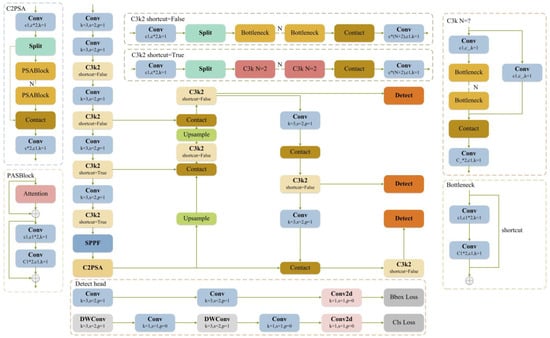 YOLOv11 is the latest advancement in the YOLO family, optimized based on YOLOv8 to achieve better performance with fewer of the parameters in the COCO dataset. Its network structure is shown in Figure 1. YOLOv11 has a significantly enhanced ability to extract features from images, thanks to its redesigned backbone and neck, and the importation of a new component, C3k2. These improvements make YOLOv11 even better at multi-target detection tasks. The efficiency of feature extraction is critical for precise target localization and classification. The new architecture of YOLOv11 greatly improves the sensitivity and accuracy of detection. YOLOv11 also makes use of a more effective architecture and training procedure. The original detection head is supplemented with two depth-separable convolution (DWConv) modules, which significantly lower the model’s parameters and computing needs while preserving excellent accuracy and accelerating processing.