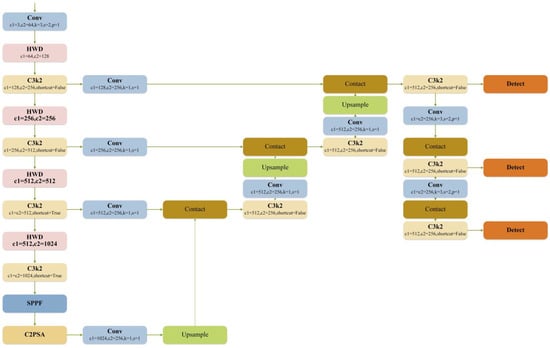 The HWD module first processes the input image with a pair of wavelet filters (including high-pass and low-pass filters). After one transformation, the input image is decomposed into three high-frequency sub-bands and one low-frequency sub-band. On the basis of encoded features, further processing is performed using convolution layers, normalization layers, and ReLU activation functions. Through this method, the main features of the signal are retained while reducing the amount of data. As a result, apart from a slight decrease of only 0.3% in precision within the high-confidence interval (mAP50-095), all the metrics showed significant improvement. Additionally, the parameters were reduced by 14.41%, indicating that the HWD module not only achieved model light-weighting, but also maintained stable precision.