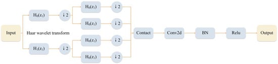 The network structure of HWD is shown in Figure 3. First, the input feature dimension is , which is processed by the Haar wavelet transform. The HWD module first processes the input image using a pair of wavelet filters, which include a high-pass filter and a low-pass filter. The filtered results are downsampled by taking one value at every other point. The Haar wavelet transform then downsamples each of the input dimensions and to half of their original size, thus decomposing the features into four sub-bands (including low and high frequencies). After processing, the size of the output feature becomes , and the number of channels is expanded to four times that of the original one, realizing more effective feature encoding without losing the key information in the feature. Finally, the convolutional layer, normalization layer, and ReLU activation function are used to further process the encoded information. While the BN and ReLU activation functions enhance the network’s expressive capability and nonlinear features, convolutional techniques are utilized to extract the local information.