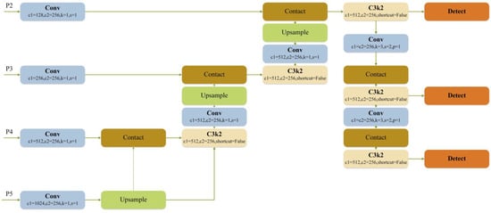 In order to take into account the detection efficiency and detection accuracy of long-range, small-size UAV targets, this paper integrates the structural concept of CCFM to design a feature fusion structure containing a small-target detection head, as shown in Figure 4. The main role of CCFM is to fuse the features of different scales, in order to enhance the model’s adaptability to changes in scales and its detection capability for small-size targets [39]. CCFM is able to effectively integrate detailed features and contextual information, thus significantly improving the overall performance of the model. Compared to the FPN structure of YOLOv11, CCFM uniformly adjusts the number of channels of the feature map to 256 before performing feature splicing. This practice not only reduces the amount of computation, but also ensures consistency in the input of the feature map, which effectively fuses the contextual information and minimizes the loss of information after the feature fusion.