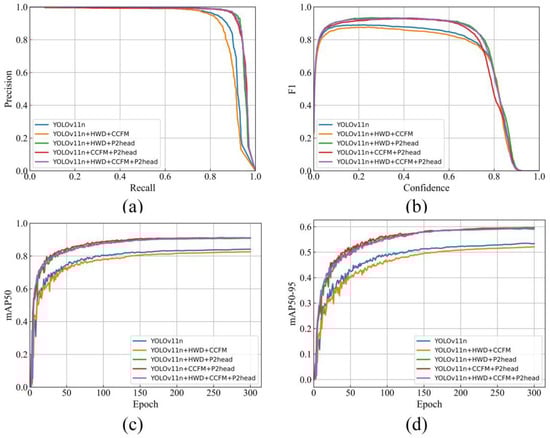 The ablation experiment’s results, which include the (a) PR curve, (b) F1 curve, (c) mAP50 curve, and (d) mAP50-95 curve, are shown in Figure 5. It is evident that the curve of the baseline model is fully encircled by the improved model. This suggests that the improved mode outperforms the baseline model in terms of accuracy, and has clear benefits.