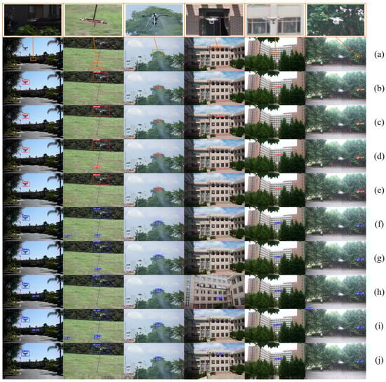 To further demonstrate the effectiveness of our proposed anti-UAV model, the results are compared with the following detection models: (a) YOLOv3; (b) YOLOv5; (c) YOLOv6; (d) YOLOv8; (e) YOLOv9; (f) YOLOv10; and (g) REDETRn. In order to efficiently compare the models’ performances, the above models were trained in the same environment and on identical datasets.