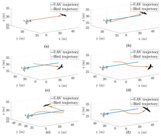 Six different operational scenarios are defined considering the following collision trajectories between the drone and the bird (Figure 1): (a) frontal collision trajectories (both with horizontal flight)—trajectory 1; (b) frontal collision trajectories (drone with horizontal flight and bird with 3° descending slope)—trajectory 2; (c) lateral collision trajectories (drone with horizontal flight and bird with 3° descending slope)—trajectory 3; (d) lateral collision trajectories (both with horizontal flight, drone with straight trajectory, and bird with curved trajectory)—trajectory 4; (e) lateral collision trajectories (both with horizontal flight, drone with curved trajectory)—trajectory 5; and (f) lateral collision trajectories (drone with horizontal flight and bird with different z-plane curved trajectory—trajectory 6. These scenarios were simulated in MatLAB [], considering a UAV flight speed of 5 m/s, a typical value achievable by most commercial rotary-wing models [,]. For the birds, the flight speeds were adjusted based on species-specific characteristics, as detailed in Section 2.2. Additionally, to guarantee that all trajectories are flyable and representative of the real bird motion, the curvature radius was constrained to ensure a maximum acceleration modulus of 5 m/s2. As will be introduced in Section 2.2, these values are adjusted based on the animal characteristics.