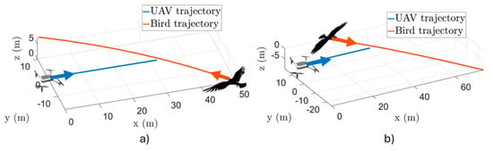 Additionally, to statistically assess the sensor’s behavior, 300 random collision scenarios were generated for each type of bird. For all these cases, a motion with constant acceleration is assumed. Thus, the bird’s relative position is given by , where represents the initial position, the initial velocity, and the acceleration vector. These values were adjusted using a random sampling of a uniform distribution. To obtain motion profiles representative of a bird, acceleration modulus is constrained to a maximum of 2 and speed modulus to the interval , where is the maximum flight speed of each bird. Furthermore, a maximum flight path angle of 15 degrees was imposed to avoid abrupt descents that may not represent typical bird trajectories. The initial positions, , were also randomized and adjusted to ensure a separation between bird and UAV of 5 to 50 m. In all the scenarios, this parameter was set to ensure the birds always remain within the field of view during the trajectory. Figure 2 illustrates two randomly generated scenarios, showing the trajectories of the bird and the UAV. In both cases, the UAV follows a straight path, while the bird’s trajectory curves slightly due to the random acceleration . The curvature radius is large due to the low values used here, but study cases included values up to 2 m/s2 to increase the variability in the bird’s speed. Nevertheless, all the simulated scenarios represent relatively smooth parabolic trajectories, representative of bird’s motion and similar to those presented in Figure 1.