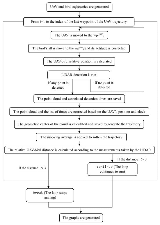 The input data for the simulator include an STL file containing the bird geometry, its geospatial coordinates, and orientation, as well as the geospatial coordinates and orientation of the drone (Figure 4). The simulation runs with a 0.01 s cycle, during which the positions and orientations are recalculated based on the predefined trajectories of the bird and the drone. Based on this information and using the ray tracing algorithm, the new LiDAR echoes are generated (Figure 5). LiDAR echoes centroid is calculated to provide range data for the simulated detection system.