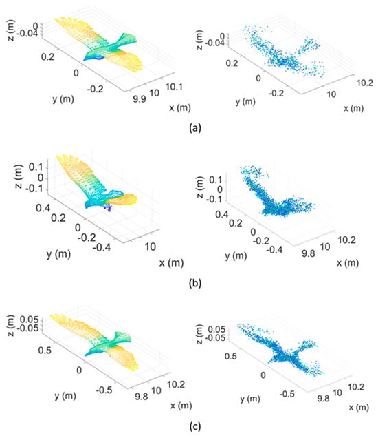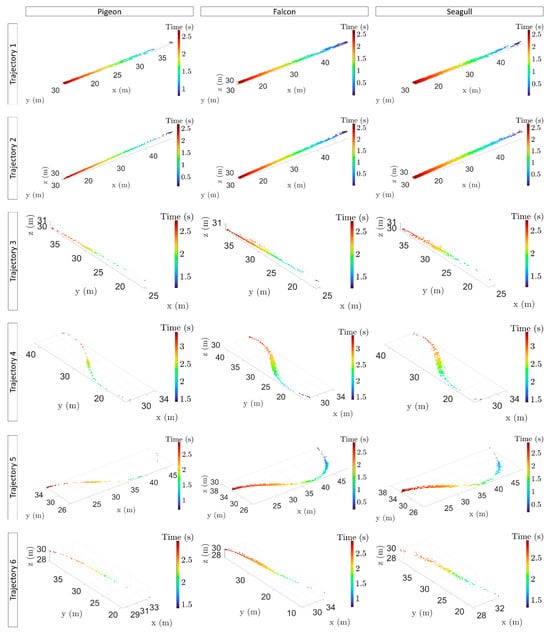 Figure 6 shows the point cloud simulated from each bird, trajectory, and LiDAR echoes. Overall, the trajectories of the birds are correctly obtained quantitatively. However, errors related to the point cloud dispersion are present. Point cloud density increases when the bird approximates the drone, yielding lower positioning errors. Moreover, note that, as expected, larger birds provide more returns at the same distance in comparison with smaller birds, thus reducing the number of errors in the measurements.