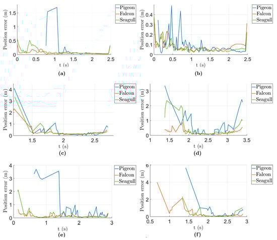 Figure 7 exhibits the detection errors for each bird and trajectory. As previously said, the positioning error decreases as the bird approaches the drone. The bird’s size also influences this. For example, in the case of the pigeon (trajectory 1; (a)), the bird is initially undetected until 0.7 s into the simulation. Between that instant and t = 1.2 s, the centroid position is highly inaccurate due to the low number of echoes, resulting in a low-resolution point cloud. Positioning errors up to 1.6 m are reported for these conditions. For t > 1.2 s, the detection improves until the end of the simulation, reducing the detection error to around 0.1 m. This trend is followed for all analyzed cases, with the one for the smallest bird (pigeon) being the most characteristic. However, all birds present relatively high errors given non-linear, direct line-of-sight trajectories. For instance, the largest scale bird (seagull) shows similar trends for trajectories 4, 5, and 6. This implies that the detection challenges occur until a specific range is reached, which is dependent on both the trajectory and the bird.
