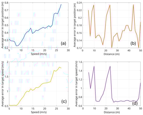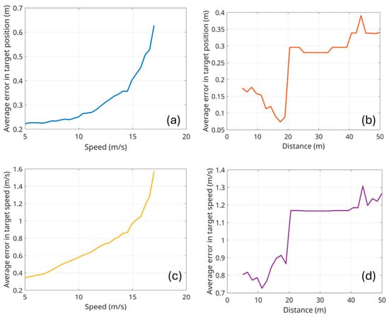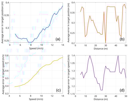 Error statistical assessment for the 300 simulated trajectories of seagull encounters: (a) average error in target position as a function of flight speed, (b) average error in target position as a function of sensing distance, (c) average error in speed estimation as a function of flight speed, and (d) average error in speed estimation as a function of sensing distance.