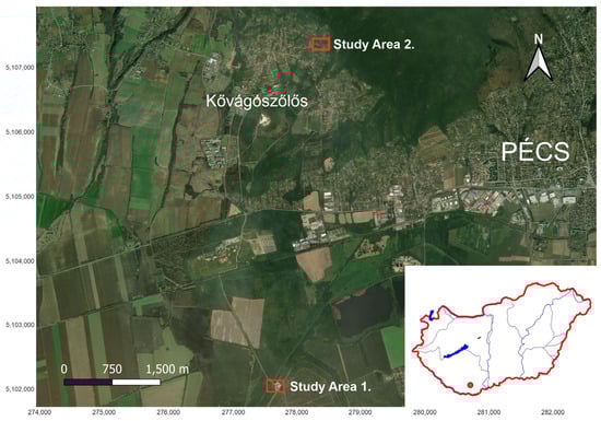 Two areas are examined in this article. Both of them are located in Kővágőszőlős, Hungary (Figure 1). This village is famous for its geological characteristics, being rich in uranium ore and a uranium mine that operated in the area from 1957 until 1997 [16]. The geological environment is dominated by the Permian Kővágőtöttös, Tótvár, and Cserkút Sandstone (as part of the Kővágószőlős Formation sections) and the Triassic Jakabhegy Sandstone Formation. In the Permian formations, conglomerate, mudstone, and aleurolite alternate [17].