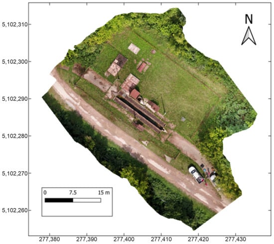 An orthomosaic made from a height of 15 m during the flight at Study Area 1 (the truck wash), displayed with UTM 34N coordinates. The trucks were parked along the dark stripe.