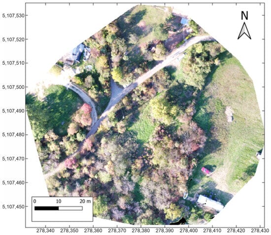 An orthomosaic made from a height of 15 m during the flight at Study Area 2 (Kossuth Lajos Street), displayed with UTM 34N coordinates. The radium anomaly is under the bushy area in the middle.