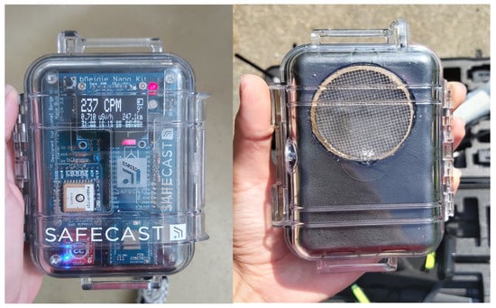 As a gamma-ray measuring unit, an easily accessible and inexpensive device has been chosen, which is called Safecast bGeigie Nano Kit (Dogenzaka (Shibuya, Japan)) (Figure 5). It is a compact and easily transportable device for monitoring gamma radiation, featuring built-in GNSS and data-logging capabilities. It records the detected counts every 5 s, storing them on a microSD card, along with timestamps and coordinates. The data are easily accessible from a computer since they are stored in text format. The bGeigie Nano employs an LND 7317 “Pancake” Geiger–Müller counter [21], which detects gamma radiation impulses. This Geiger–Müller tube is a recessed cylinder filled with neon and halogen gases, about 1 cm thick. The device’s components are housed in a waterproof polycarbonate case resembling a Japanese lunchbox, hence the “b” in bGeigie Nano stands for “bento”, the Japanese term for lunchbox [22,23].