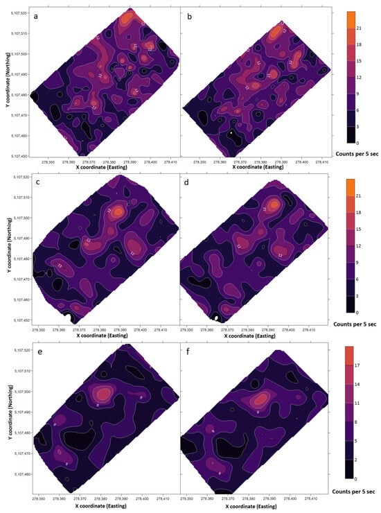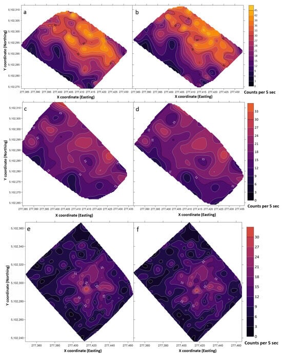 Maps of the gamma-ray intensity in units of counts per 5 s at Study Area 1 (truck wash). On panels a and b, the height of the flight was 5 m above ground level (AGL), on panels c and d, it was 15 m AGL, and on panels e and f, it was 25 m AGL. The left side panels (a,c,e) refer to maps based on autonomous GNSS data, on the right panels (b,d,f), maps are based on more precision position data from UAS RTK GNSS. The coordinates are in UTM format, and UTM zone is 34N.