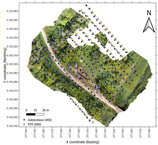 Two data series are shown overlapping each other in Figure 10. The set of dots in blue indicates the position of autonomous GNSS measurement points, while the set of yellow dots connected by a yellow line indicates the RTK GNSS points of the same dataset at Study Area 1. It can be seen that the x and y deviations between the datasets of points are not consistent, so the x and y deviations were calculated, and their Euclidean distances from each other were determined also.