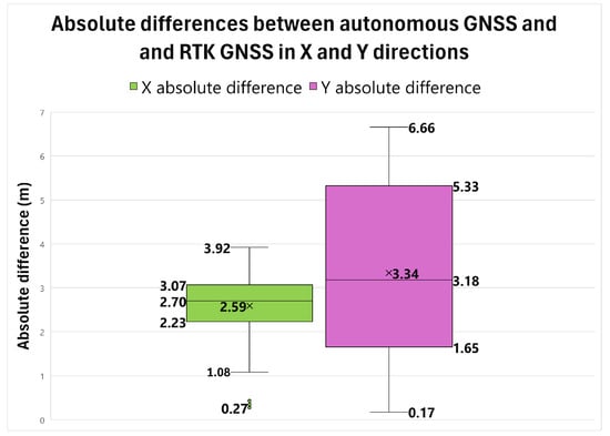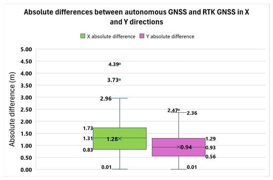 Absolute differences between autonomous GNSS and RTK GNSS in X and Y directions [m] at Study Area 1.