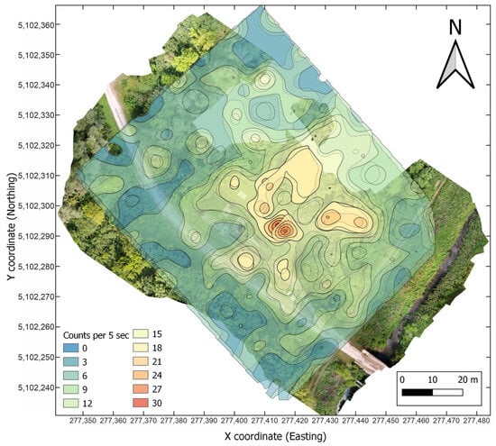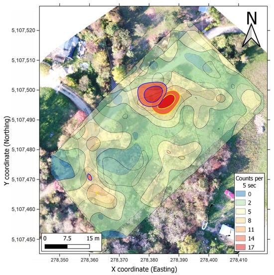 The difference is also illustrated on overlapping isoline maps. The two maps of the Study Area 1 (Truck Wash) anomaly at 25 m height were overlayed, as shown in Figure 13. The maximums of the gamma intensity on each map are at different coordinates. The distance between the maximum position determined by the two different GSNN systems is about 3 m.