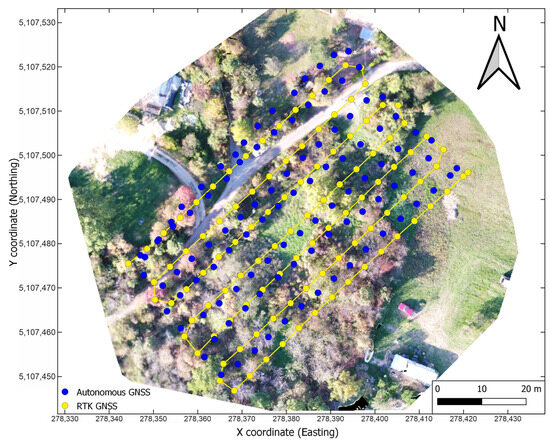 GNSS comparison of the 25 m altitude survey data series of Study Area 1 (truck wash), where blue dots indicate the autonomous GNSS unit data and yellow dots indicate the RTK GNSS unit position measurements.