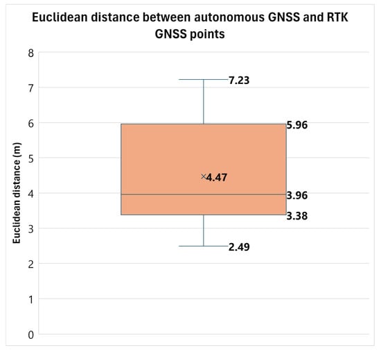 Euclidean distance between corresponding autonomous GNSS and RTK GNSS points at Study Area 2. The boxplot shows that the Euclidean distance has an asymmetrical distribution, with an average of 4.5 m.