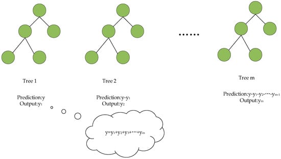 The principle of GBDT is illustrated in Figure 3. GBDT enhances the model’s predictive performance by progressively building a series of decision trees. First, GBDT starts with the first tree (Tree 1), using its output as the initial predicted value . Then, the second tree (Tree 2) does not directly predict the target value , but fits the residual of the first tree, that is, , obtaining output . Subsequently, each new tree sequentially learns the residuals (errors) from the previous trees, such as , until the last tree (Tree m). The final prediction is the sum of all tree outputs, expressed as . By gradually reducing the prediction error, the GBDT model can approximate the true target values, thereby significantly improving overall predictive accuracy.