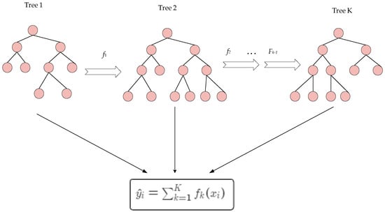 XGBoost, as illustrated in Figure 4, enhances predictive performance by constructing a sequence of multiple decision trees. First, the process begins with the first tree (Tree 1), generating the initial prediction . Next, the second tree (Tree 2) is trained to fit the residuals of the previous tree (which is the difference between the current prediction and the actual value), producing . This process continues iteratively, with each subsequent tree further reducing the residual errors based on the previous tree, until the final tree (Tree K) is constructed. The final prediction is the sum of the predictions from all trees, expressed as . This cumulative approach allows the model to gradually reduce errors, significantly improving predictive accuracy. Compared to traditional gradient boosting methods, XGBoost introduces regularization to control model complexity and prevent overfitting, while employing efficient parallel computing and tree structure optimization algorithms to improve training speed and performance.