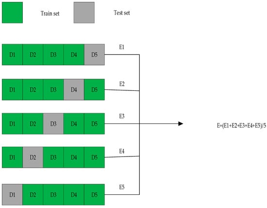 As shown in Figure 6, we performed stratified sampling on the data-augmented GPS signal dataset, dividing it into five non-overlapping subsets. In each iteration, one subset was used as the test set, while the others served as the training set. This process was repeated five times, with each subset serving as the test set once. The model was trained and evaluated in each iteration, yielding five evaluation results (E1, E2, E3, E4, E5). Finally, we obtained the overall performance evaluation of the model by calculating the average of these five results (E = (E1 + E2 + E3 + E4 + E5)/5). This approach allows for a more robust evaluation of the model’s performance, reducing the bias that may result from a single data split.
