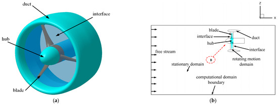 The ducted propeller. (a) Schematic of the 3D model; (b) schematic of the computational domain.